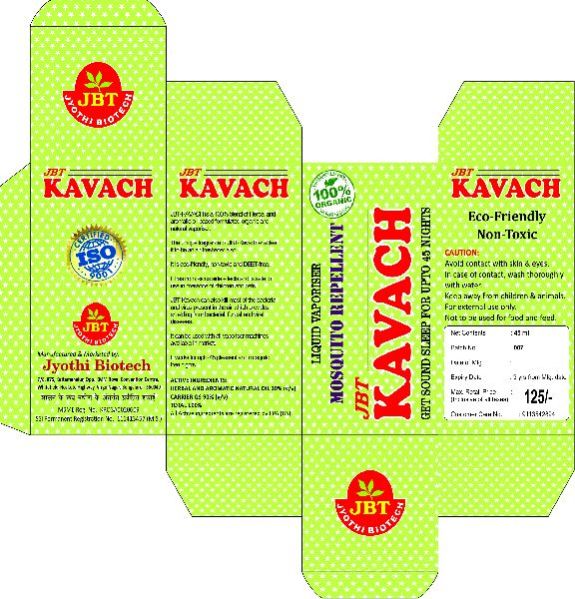 JBT-KAVNACH is a 100% blend of Herbal and aromatic oil-based fomulated organic and natual vaporiser. The urique fraganoe of JBT-Kavach enables it to be an air freshener also. It is eoo-?iendly, non-toxic and IJEET-free. lthasnorioxioussidee?ectsamlissafeto usein presenceofchildrenand pets. JBT-Kavach can also kill mast cithe bacteria andvirus present inlheairvihioh prwides shielding from bacterial, fungal and viral diseases. ltcanbeusedwithall vaporisermachinesavailable in market. It works for upt045 ple$ant amt rmsquito free nights.
